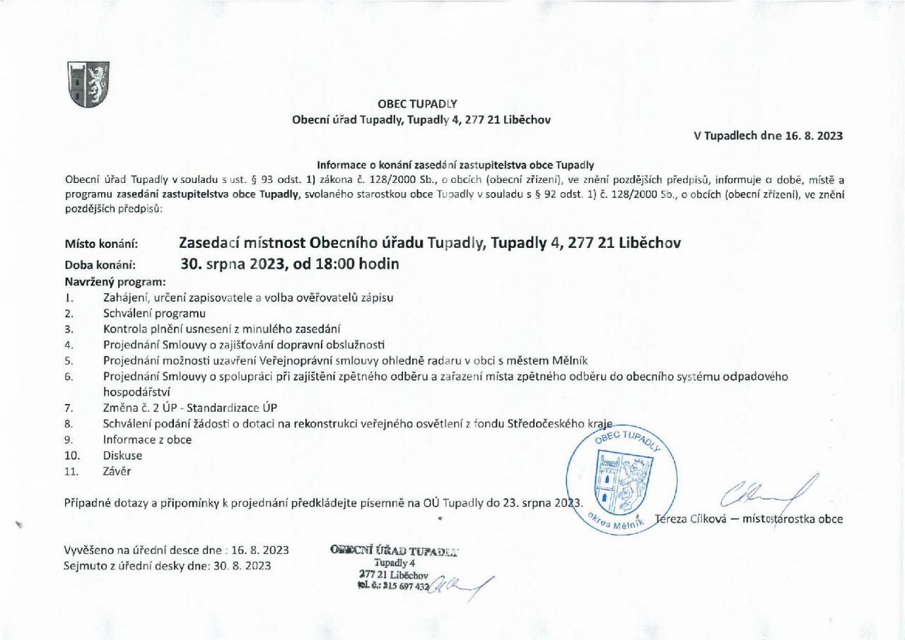 Dne 30. srpna 2023 vás zveme na zasedání zastupitelstva obce.